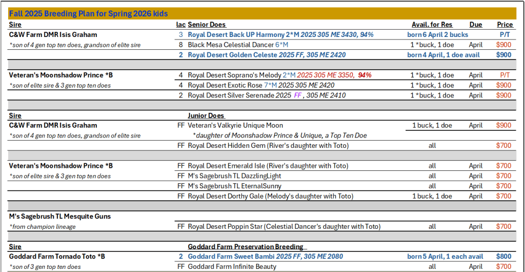 1 doeling born 5 April 2026 Dam: Sweet Bambi Sire: Tornado Toto (Goddard preservation breeding)